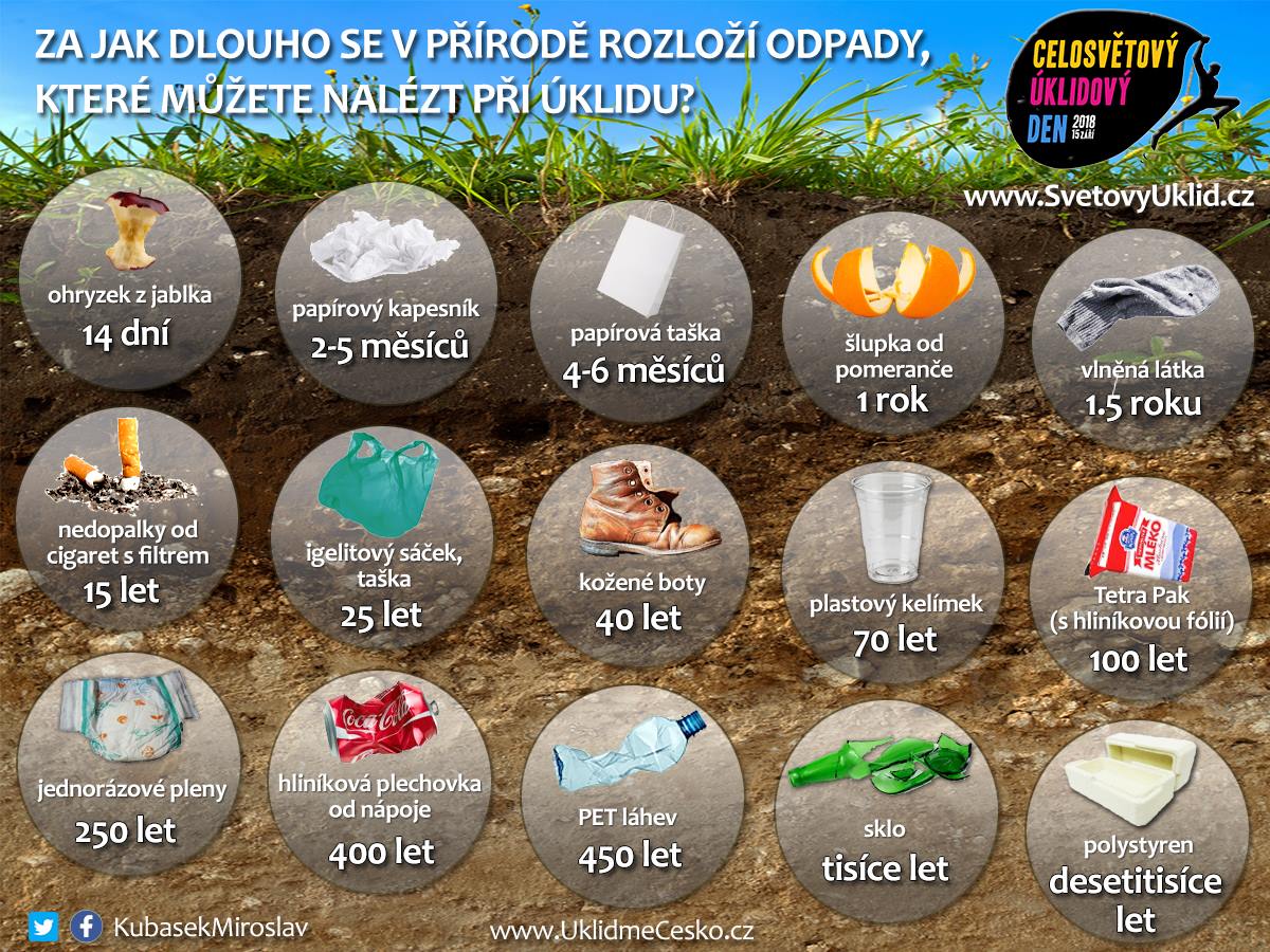 Na Celosvětový úklidový den: World Cleanup Day si můžete vzít k ruce tuto infografiku, ve které pro vás Miroslav Kubásek přehledně nachystal doby rozkladu nejběžnějších odpadů, na které můžete při úklidu narazit.