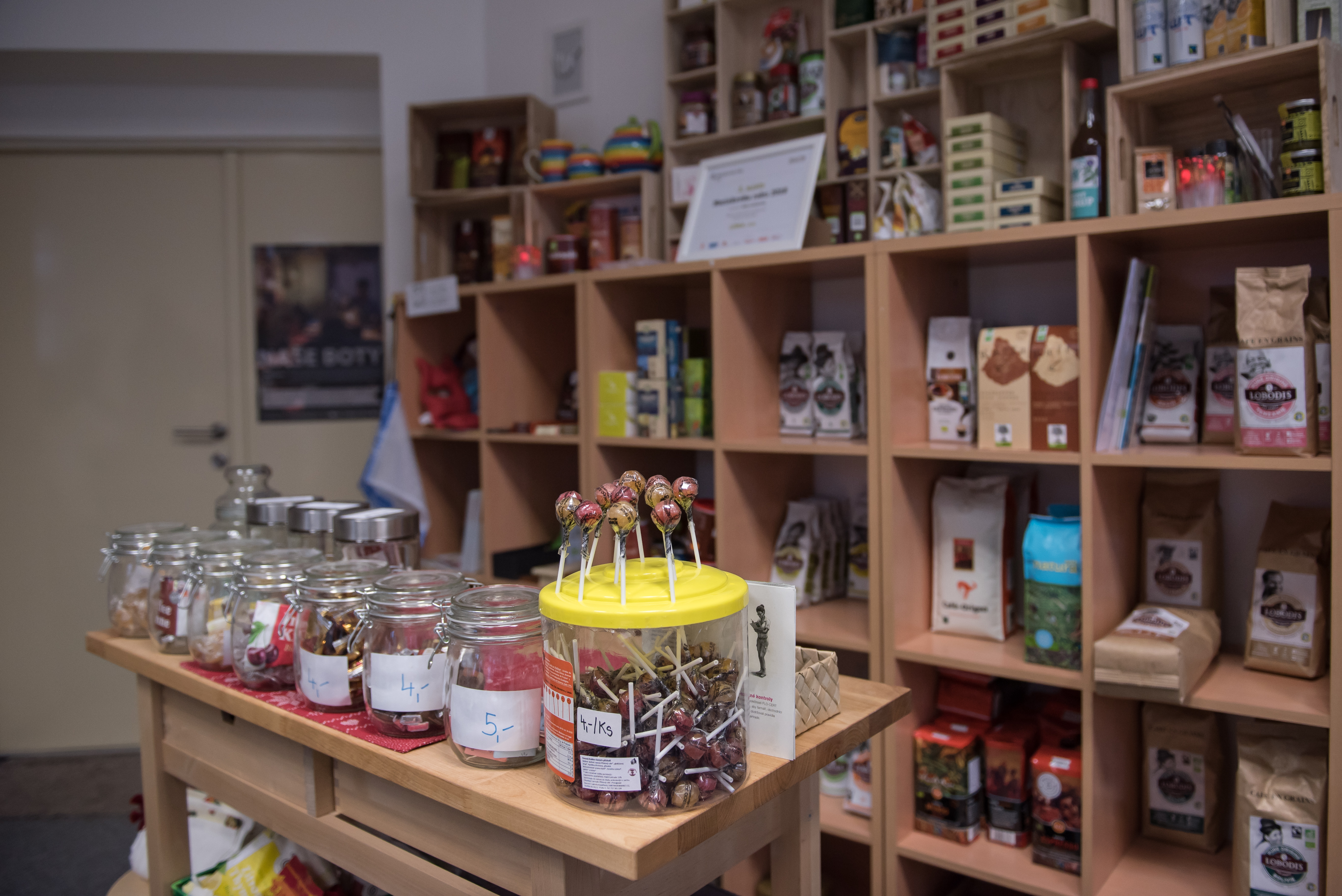 Ve Férovém obchůdku LÍSKY je možné zakoupit kávu, čaj, kakao, kokos, nutelu, čokolády, sušenky, lízátka, koření a další faitradové dobroty, Lukášovy šité hračky a sáčky na bezobalové nakupování.