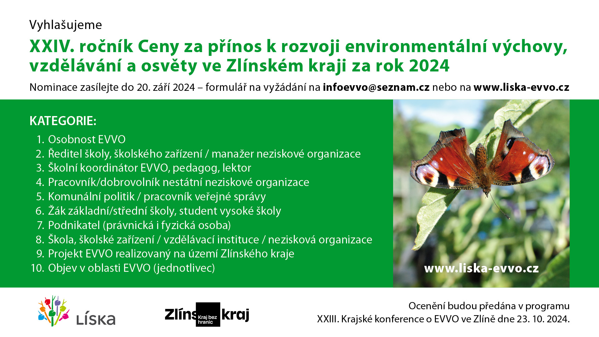 Ocenění budou předána v programu XXIII. Krajské konference o EVVO ve Zlíně dne 23.10.2024.