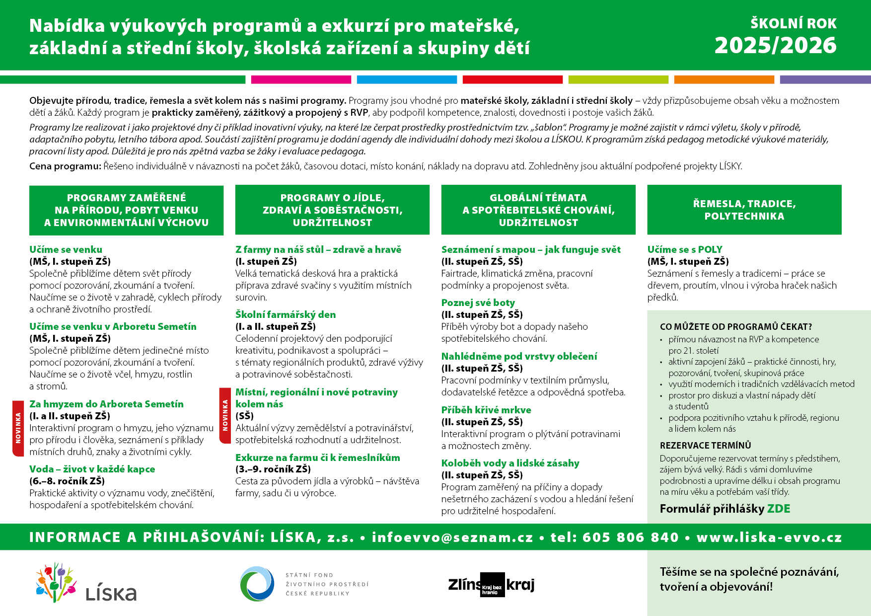Součástí zajištění programu je dodání agendy dle individuální dohody mezi školou a LÍSKOU.