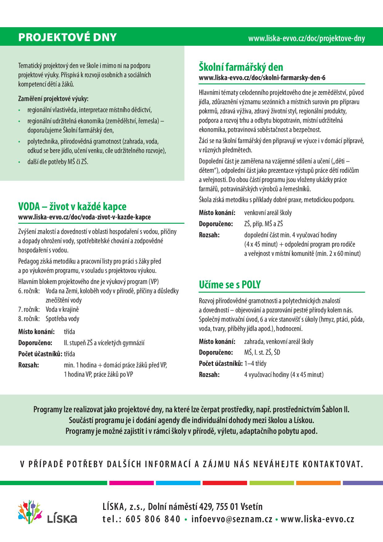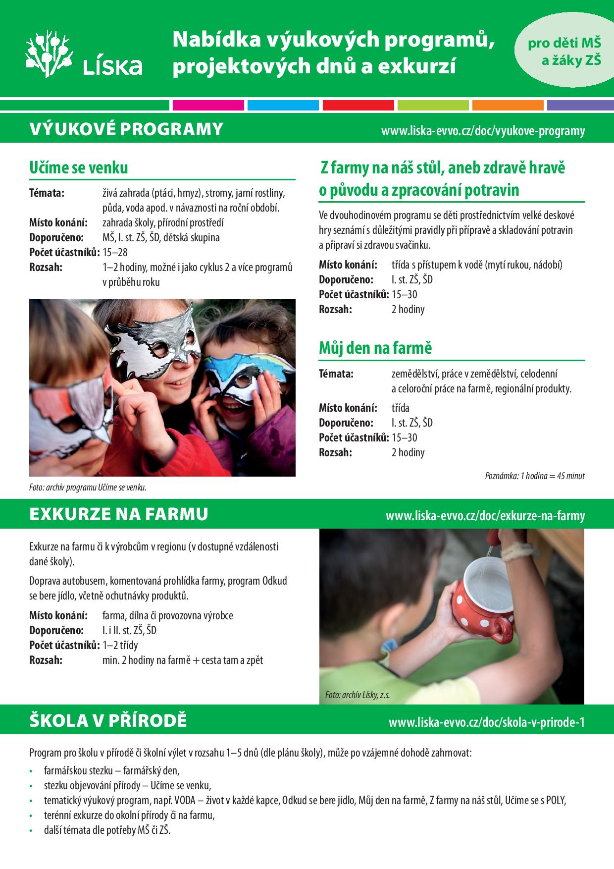 LÍSKA, členské a partnerské organizace nabízí školám: výukové programy, projektové dny, školní farmářské dny, exkurze na farmy, přírodovědné exkurze s průvodcem, programy v rámci školy v přírodě, výletu, adaptačního pobytu a další.