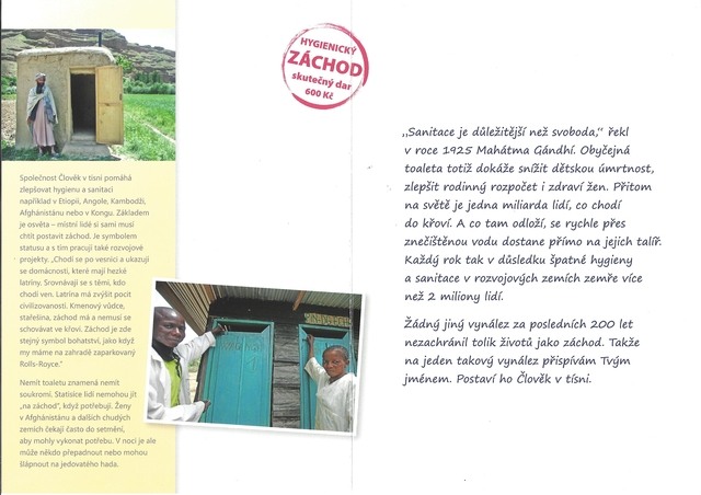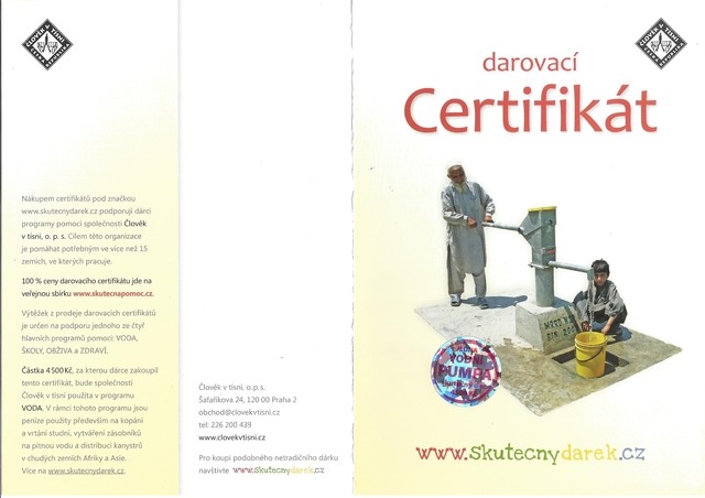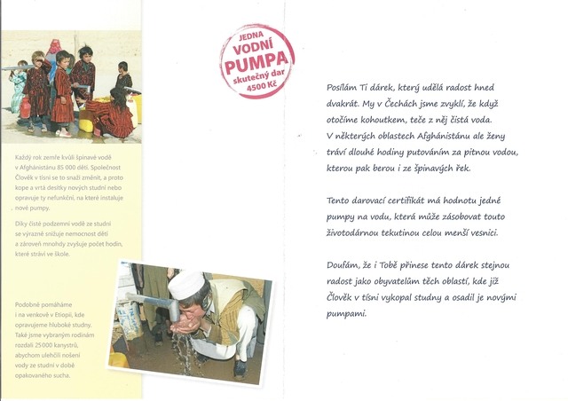 Na základě zjištění, že aktuálně není otevřen žádný projekt na podporu technologií pro čištění vody v Afghánistánu, vybrali pracovníci LÍSKY z dalších návrhů žáků a zaslali dar organizaci Člověk v tísni: částka ve výši 4.500 Kč je určena na pořízení pumpy na čistou a zdravou vodu v Etiopii, částka 600 Kč na osvětovou kampaň postavte si svoji latrínu v Angole, www.skutecnydarek.cz