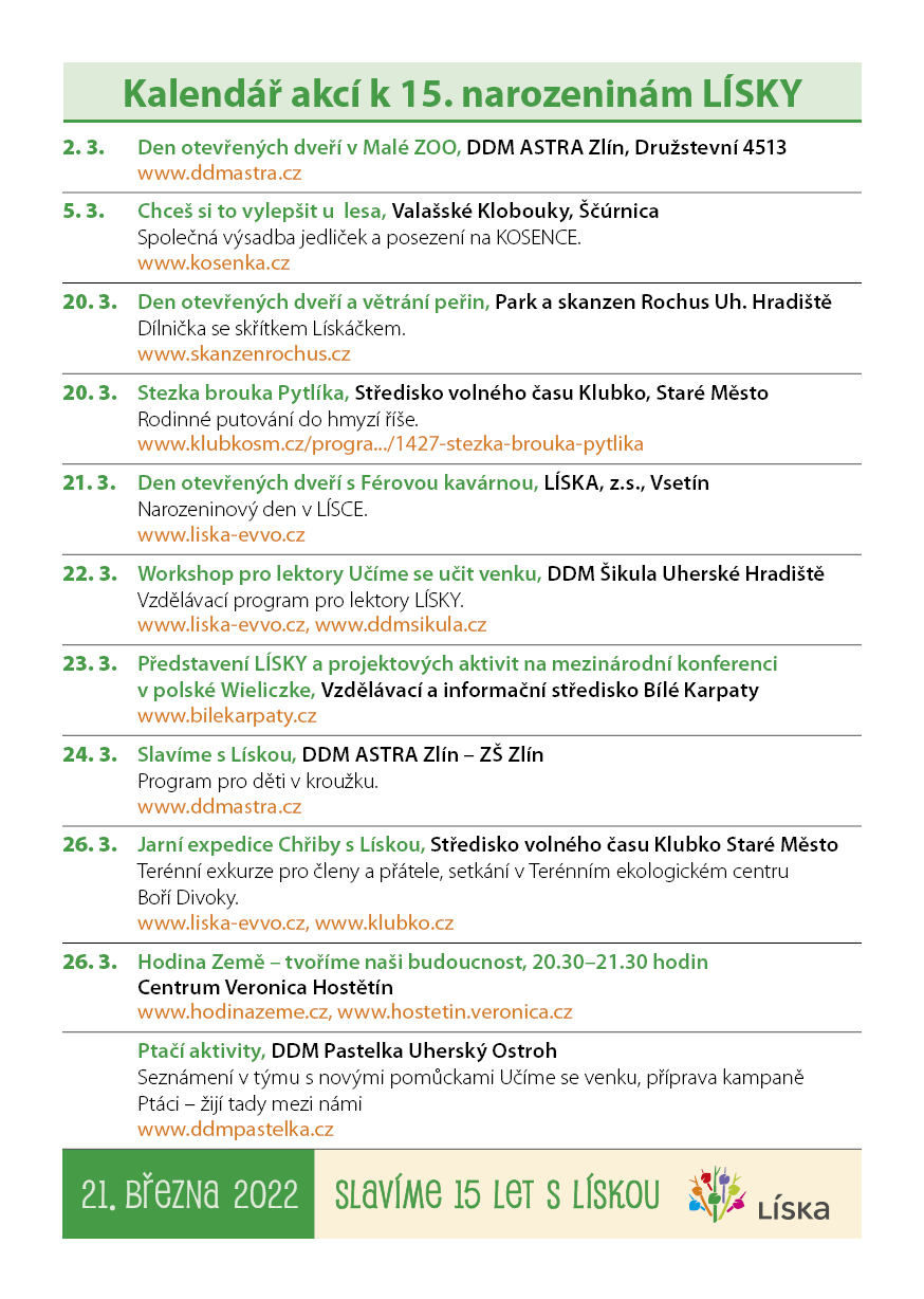 V pondělí 21. března oslaví LÍSKA 15. narozeniny. Od roku 2007 poskytuje vzdělávání a informace v oblasti environmentální výchovy ve Zlínském kraji.