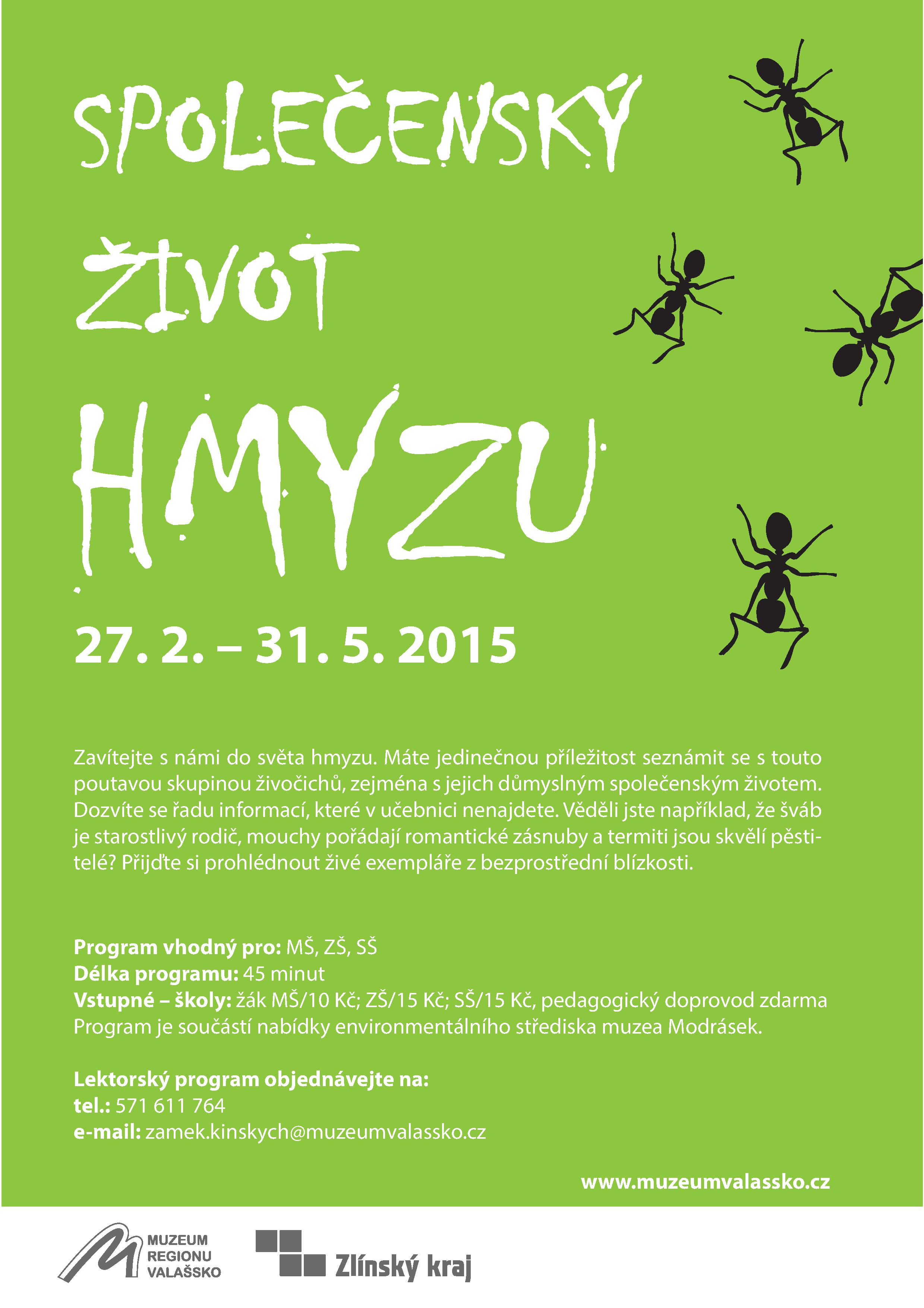 Lektorský program, který můžete navštívit do 31. 5. 2015 v zámku Kisnkých ve Valašském Meziříčí. Výstava seznamuje s tajemným světem hmyzu a s tím, jak jejich společenstva žijí.