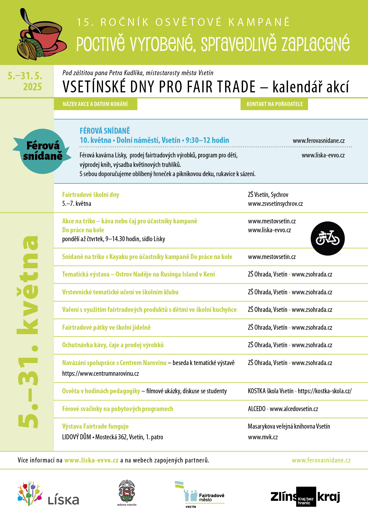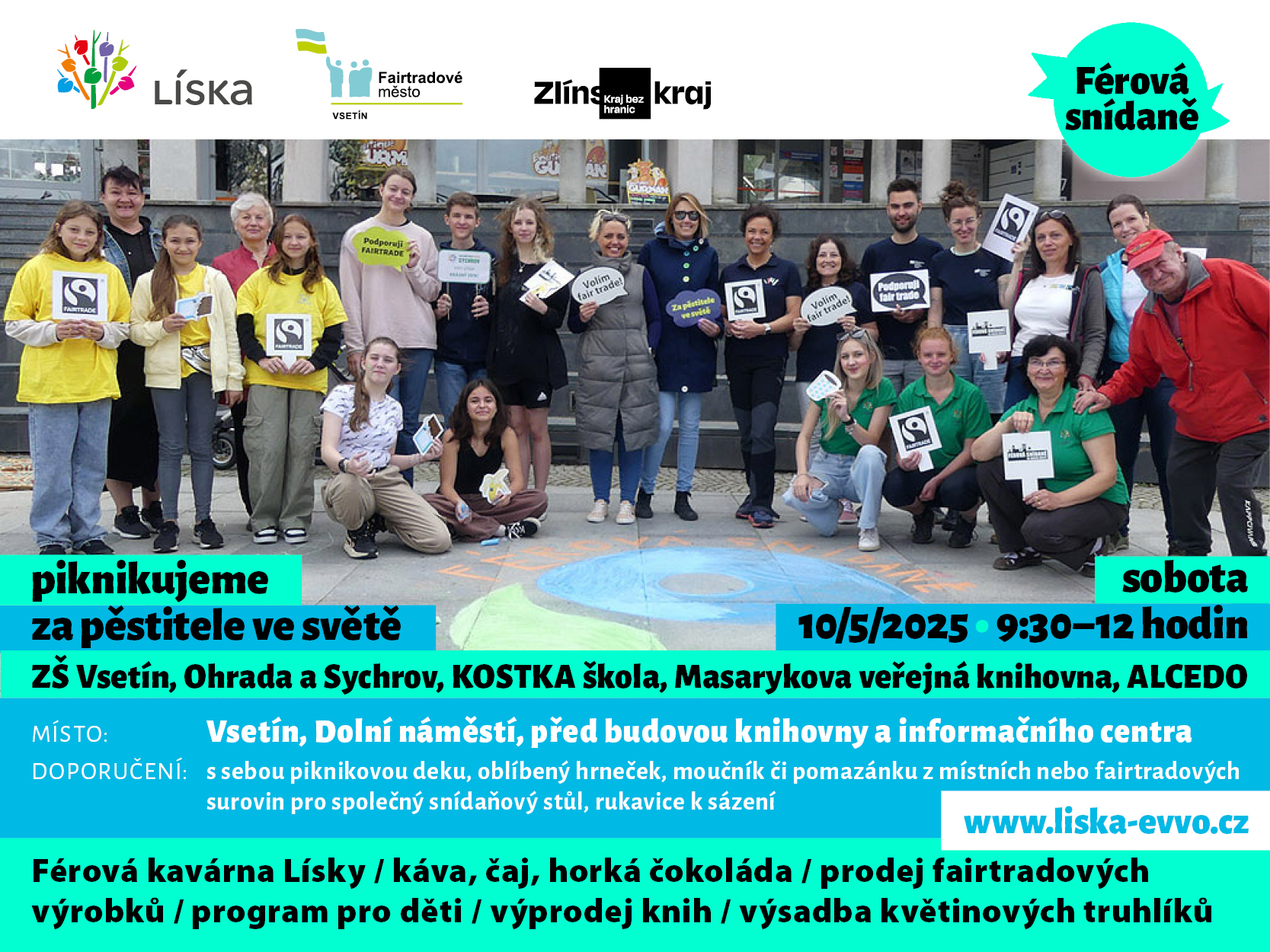 Férová snídaně se u nás koná od roku 2011 a postupně se z ní stala největší česká akce na podporu fair trade a pěstitelů. Fairtradové město Vsetín se v rámci projektu Místní agendy 21 společně s Lískou a dalšími partnery tradičně připojuje k podpoře této oblíbené události.