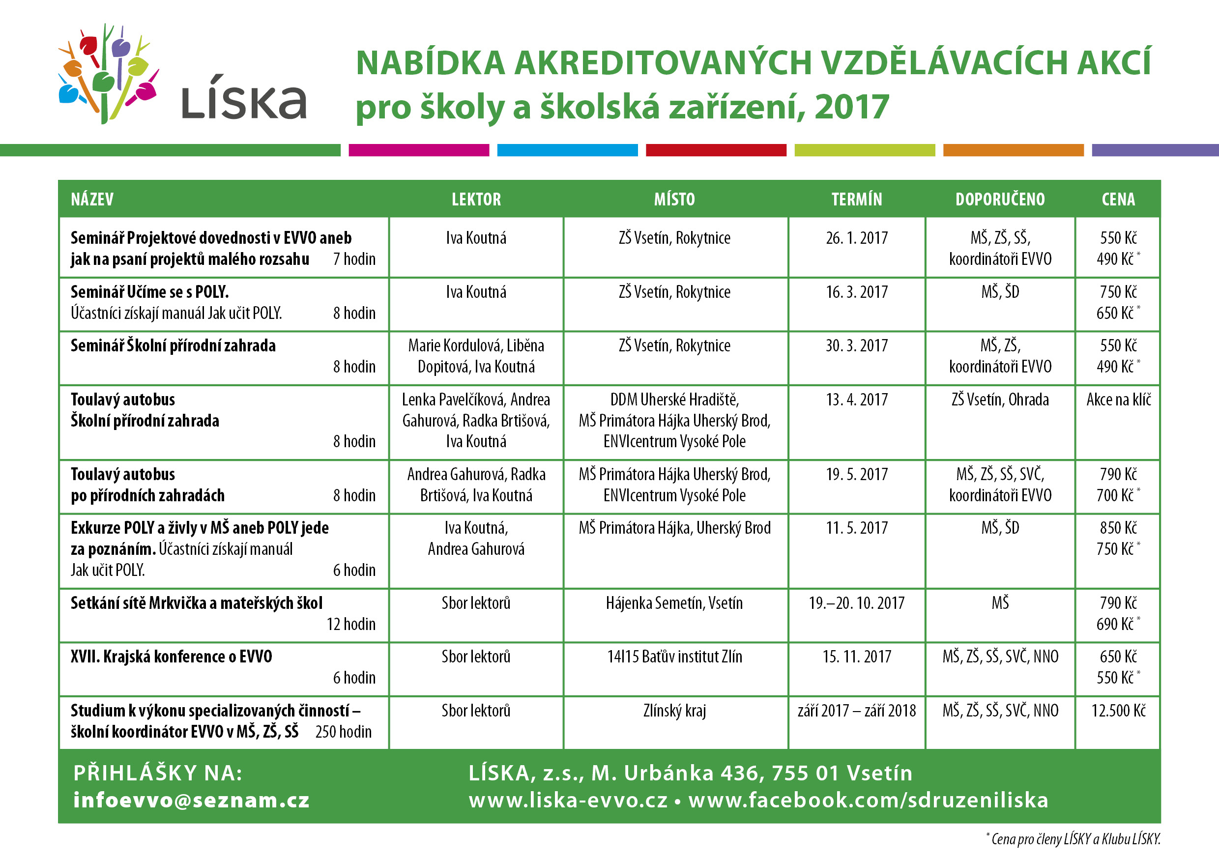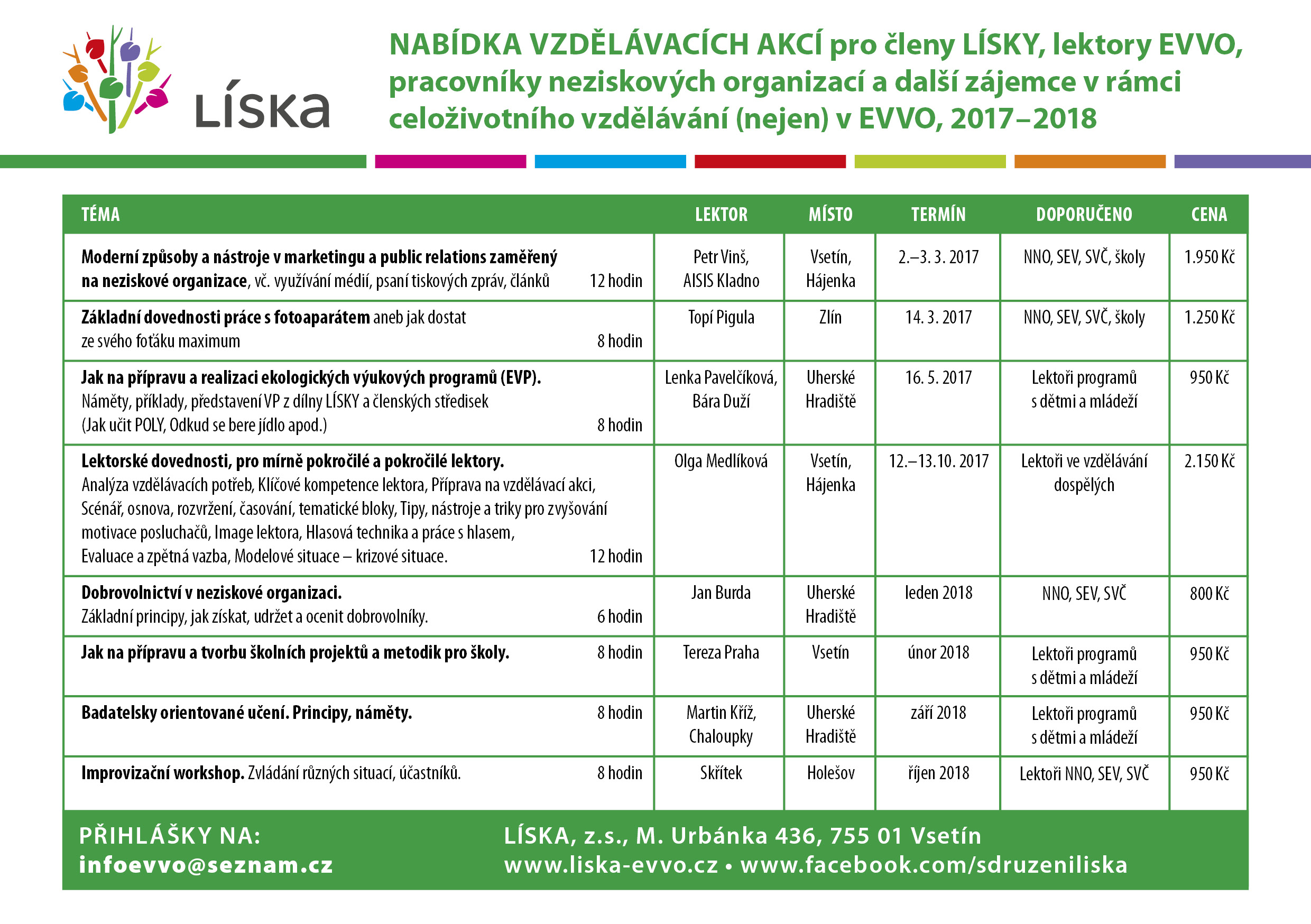 Aktuální nabídku vzdělávacích akcí Lísky, pozvánky a přihlášky ke stažení zveřejňujeme na www.liska-evvo.cz/doc/seminare-a-kurzy-pro-ucitele.