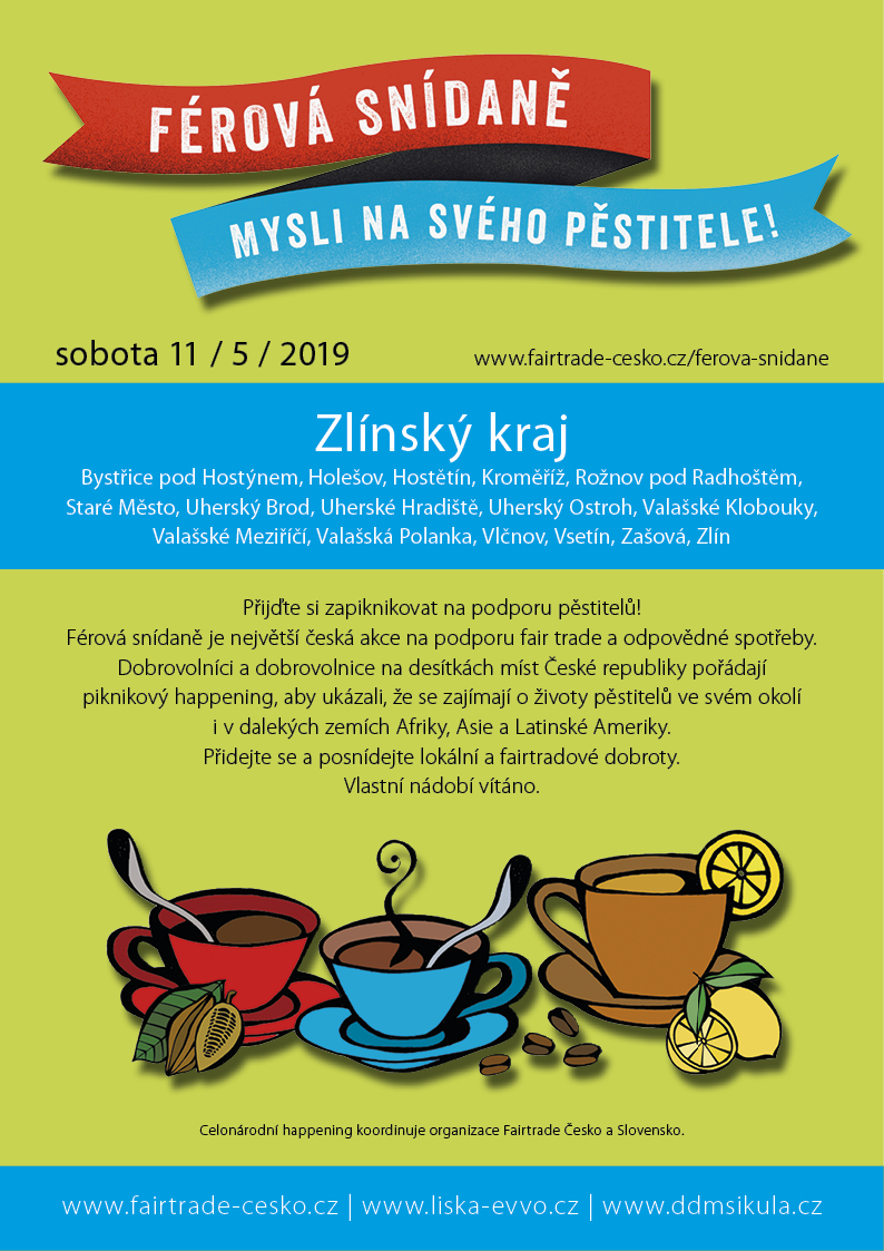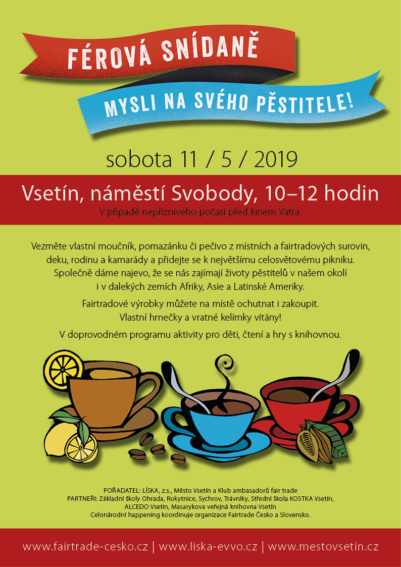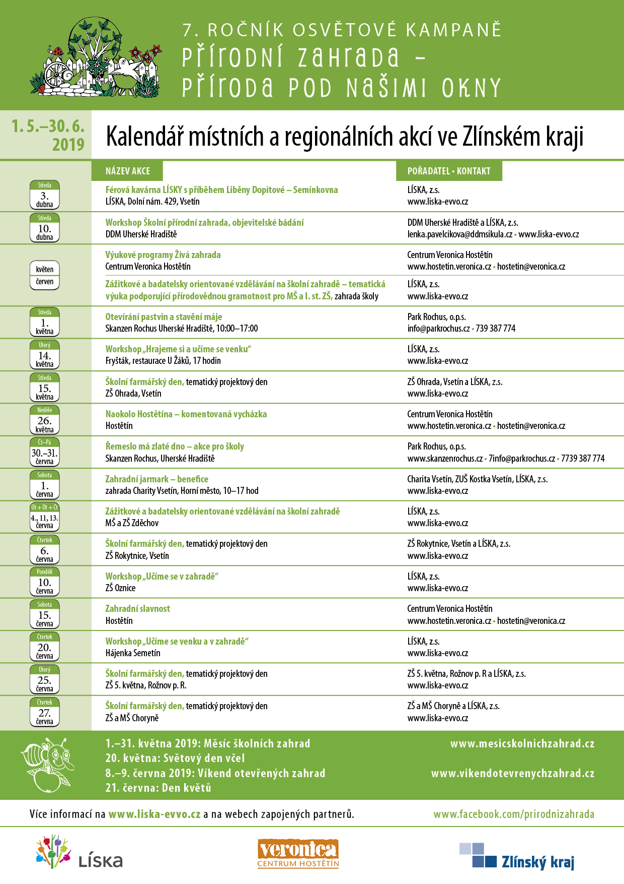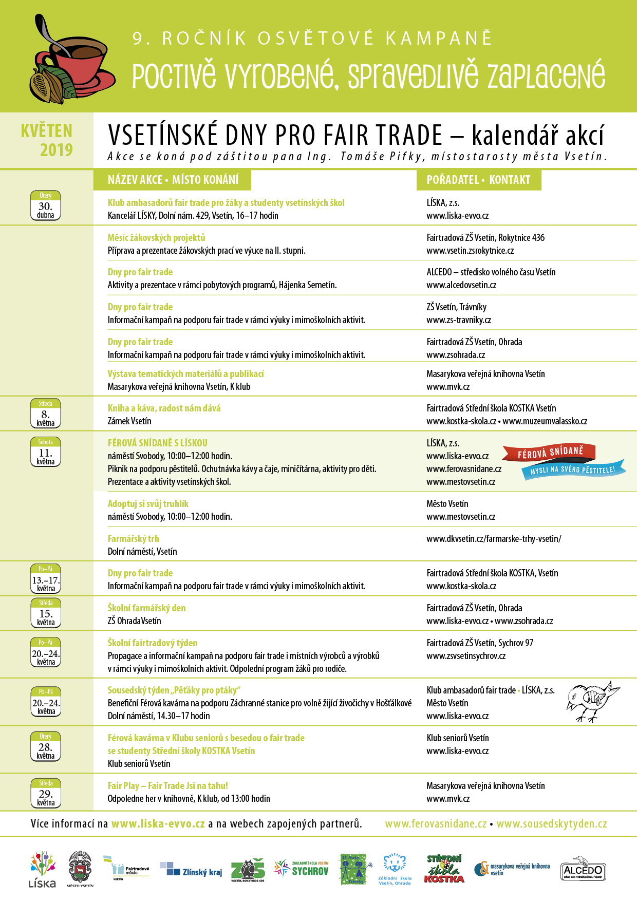 Ve středu 1. května navazujeme kampaní Přírodní zahrada – příroda pod našimi okny (trvá do 30. 6.), http://www.liska-evvo.cz/doc/prirodni-zahrada-priroda-pod-nasimi-okny a o týden později, 9. května následuje kampaň na podporu fair trade (do 31. 5.). Tradičně nejvíce akcí připravuje Vsetín, který má už 4 fairtradové školy! http://www.liska-evvo.cz/doc/poctive-vyrobene-spravedlive-zaplacene